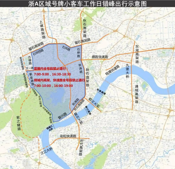 通俗地说就是: 工作日白天,“非浙A号牌”能开进杭州市区高架道路的只有10:00—15:00这个时段。其余时间段,在绕城高速范围内的地面道路,也有早晚全号段限行。